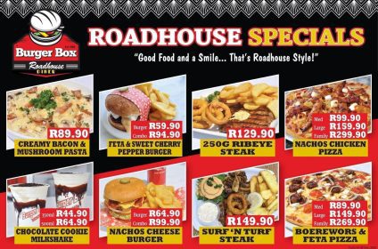 The Burger Box Roadhouse prides itself on providing delicious meals cooked on the premises in the original Roadhouse style, using the freshest ingredients of the highest quality. Their motto of “Good Food and a Smile… That’s Roadhouse Style” is reflected in their quick and friendly service, comfortable setting, generous portions, and competitive pricing.