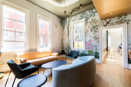 Embracing the natural beauty of the Presidio National Park, Dalida’s design exudes a sense of tranquility with soft, natural colors and repurposed furniture items from the Presidio. Bay Area artist Emily Parkinson’s mural and hand-drawn wallpaper add an artistic touch to the ambiance.