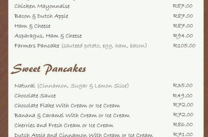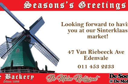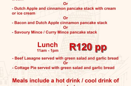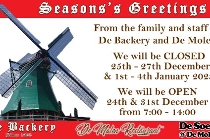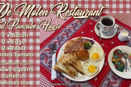 The windmill was built in 1996 and is a ¾ size replica of the Zeldenrust Molen which stands in Groningen in Holland. The copy windmill was named De Willem as this is a name that is carried by four generations of the Verhoogt male family. Originally the Verhoogt family wanted to put up a neon sign with a windmill design to make our bakery more visible, once we received the quotes it was decided to rather look at putting up a real windmill and to use it for offices, this concept grew to be a pancake house and coffee shop as we realised that a lot of our customers come from far and would appreciate somewhere to eat and drink before returning home.