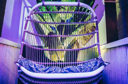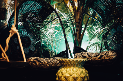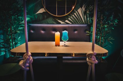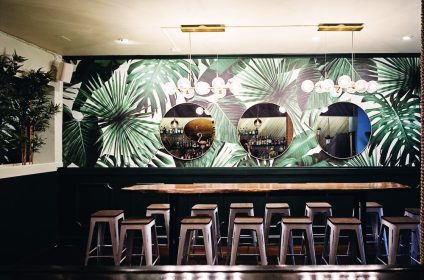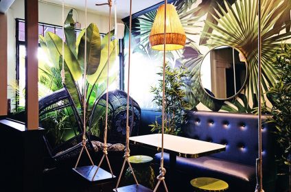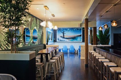 Welcome to Del Mar, a vibrant and tropically inspired bar and lounge nestled in the heart of San Francisco’s Marina district. Step into a world of tropical paradise, where custom jungle print wallpaper murals by Flavor Paper and hand-built swings and swing chairs create a unique and inviting ambiance. Local artist Camer1’s spray-painted surf mural adds a touch of artistic flair, while the 14 ft natural edge walnut slab communal table stands as a stunning centerpiece.