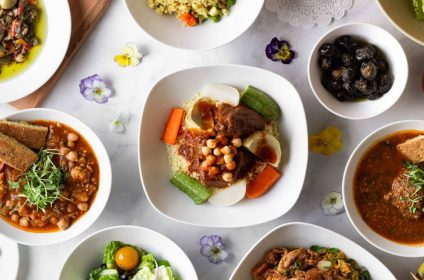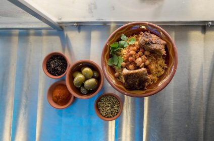 Delight your taste buds with signature dishes like tli tli bdjedj, a tantalizing chicken tomato stew seasoned with North African spice blend ras el hanout, served over steamed orzo. Or opt for the special version of couscous, accompanied by a delectable stew of lamb neck, chickpeas, and carrots, accentuated with a flavorful sauce made from water, onion, black pepper, and the essential ras el hanout—a cherished family recipe from Wafa’s homeland in Algeria, traditionally served during holidays and celebrations.