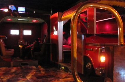 Step inside Kozy Kar, and you’ll be transported to a world where vintage meets eclectic. The decor is a delightful mishmash of yesteryear’s treasures, featuring a captivating collection of taxidermy animals and an ambiance that exudes nostalgia. As you settle in, you’ll find yourself in a booth reminiscent of 1970s vans, complete with shag carpets, mirrored ceilings, and even a tricked-out GMC van booth for a truly immersive experience.