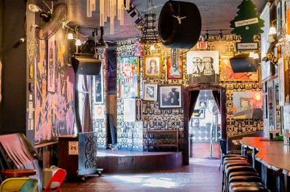 Rotating art installations share space with a bar, couches & a tiny dance floor where DJs entertain.