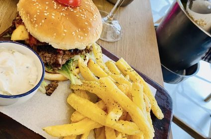 You’ll find us nestled in a vibrant corner of a trendy urban setting, ready to serve you from midday to late evening. Our waiters will warmly invite you to take your seat at beautifully decorated tables, decked with clear blue water bottles and wine glasses that glisten under soft lighting. Expect to be greeted by the heavenly aroma of delicious and enticing food as you settle at your table.