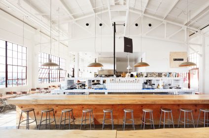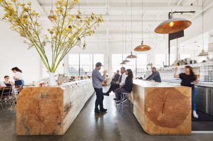 At Radhaus, history and design intertwine effortlessly. The space once housed a U.S. Army machine shop, and Envelope A+D has artfully preserved its historic elements while adding contemporary touches. Vaulted ceilings, an open floor plan, and industrial design create an inviting ambiance, but the real showstopper is the wall of windows that open up to showcase the stunning views of the San Francisco Bay.