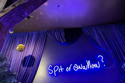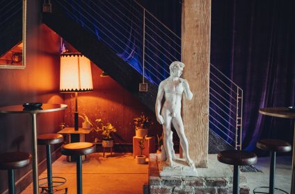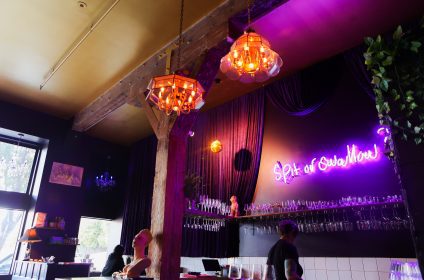 Step into a seductive purple ambiance, with suggestive neon signs and captivating chandeliers casting a playful glow throughout the space. It’s a place where lightheartedness reigns, and guests can indulge without taking themselves too seriously.