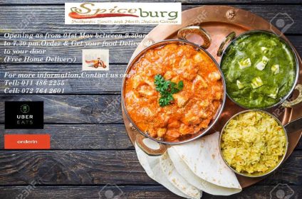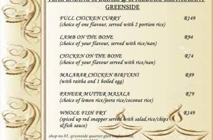 Spiceburg Restaurant is situated on Gleneagles Road road in the trendy, bustling suburb of Greenside. With the verandah covered, guests can enjoy the outside hustle and bustle in any weather. The interior is modern with an unmistakable Indian feel to it with the rich tapestries on the walls.