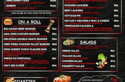 Last on our list of 10 best restaurants in Krugersdorp. Join SuzieQ’s Restaurant and Music Bar for a night of live music and good food. The restaurant offers a variety of delicious meals, including burgers, curries, pizzas, salads, and more. Customers can enjoy their meals with family and friends and unwind with a cold drink. SuzieQ’s is the perfect spot for those who love good music, good company, and great food. Check out their menu online and place an order for delivery or collection. The kitchen closes at 09:00 pm.