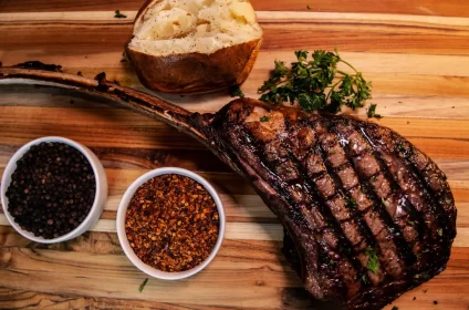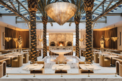 “The Palm Court is a live-fire restaurant located in RH San Francisco’s Gallery at the Historic Bethlehem Steel Building. Recalling the distinctive glamour of San Francisco’s Gilded Age, the stunning statement space is sheathed in Italian Calacatta gold marble and features a cascading center fountain, towering Medjool date palms and glimmering chandeliers. Adjacent to the restaurant, two luminous wine bars offer exceptional wines and Champagnes from around the world.”