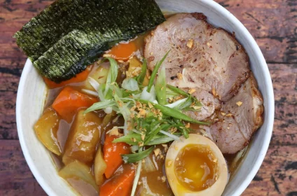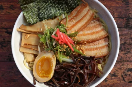 Indulge in the goodness of our delicious organic pork and chicken broth, meticulously prepared and topped with an array of fresh veggies. Customize your bowl with your choice of tender roasted pork shoulder (Chashu) or flavorful braised pork belly (Kakuni). Tailor your ramen to perfection with fried garlic, black garlic, and just the right amount of spiciness, catering to your personal taste.