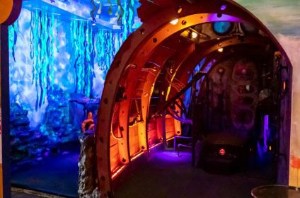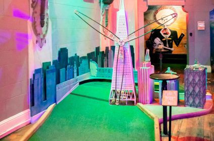 Urban Putt is a mini golf course with an accompanying restaurant in the Mission District of San Francisco. The course has 14 holes, and features black-light walls and hand-designed high-tech infrastructure at each hole. There is also a cocktail bar upstairs.